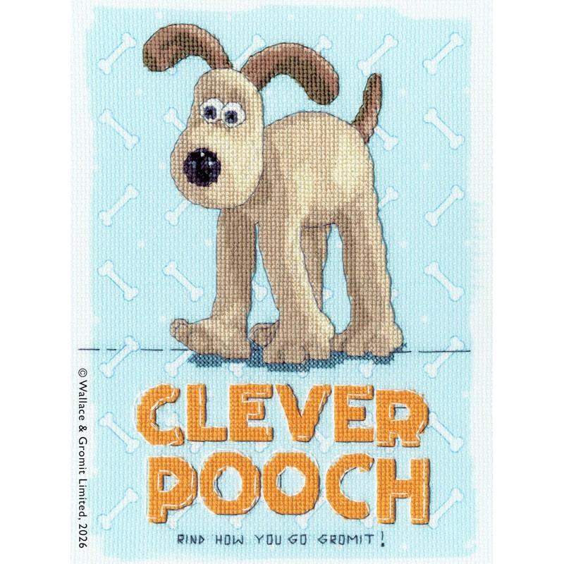 Die Stickpackung Clever Pooch! von Bothy Threads zeigt Gromit in einer charmanten, humorvollen Szene, die perfekt zur beliebten Kultfigur passt. Gromit steht vor einem hellblauen Hintergrund, der mit kleinen weißen Knochen verziert ist – ein liebevolles Detail, das das Motiv besonders lebendig macht.