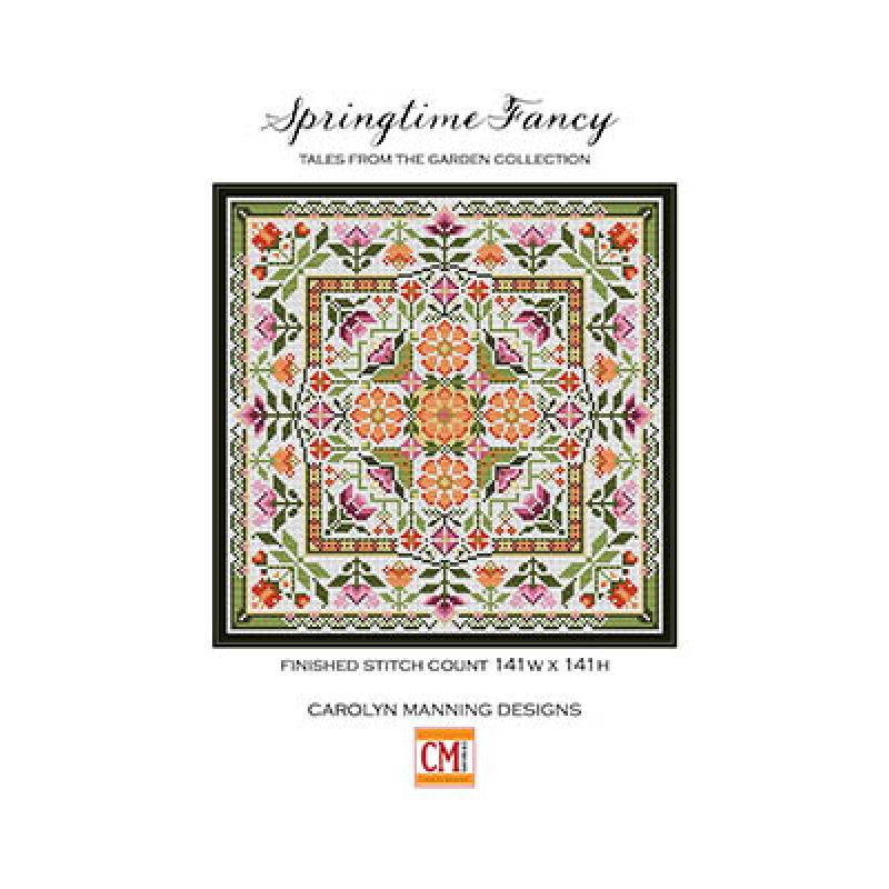 Die Stickvorlage Springtime Fancy von Carolyn Manning Designs ist ein farbenfrohes, symmetrisches Frühlingsmotiv aus der Tales from the Garden Collection. Im Zentrum steht ein reich verziertes Blumenornament, das von mehreren dekorativen Rahmen eingefasst wird. Die Komposition verbindet florale Elemente mit geometrischen Mustern und schafft so ein harmonisches, lebendiges Gesamtbild.