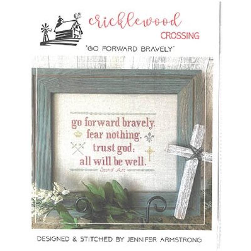 Go Forward Bravely Stickvorlage, Cricklewood Crossing Design, Jeanne d’Arc Zitat Stickmuster, inspirierendes Kreuzstichmotiv, modernes Typografie Stickdesign, christliches Stickmuster, motivierendes Stickprojekt, minimalistisches Kreuzstichdesign, spirituelle Stickvorlage, kleines schnelles Stickprojekt