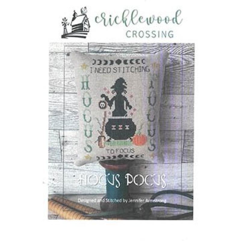 Hocus Pocus Stickvorlage, Cricklewood Crossing Halloween, Hexe Kessel Stickmuster, spooky cross stitch, Halloween Kissen Stickvorlage, humorvolle Stickerei, Kürbis Kreuzstich, kleines Halloween Projekt, Herbst Stickmuster, Jennifer Armstrong Design