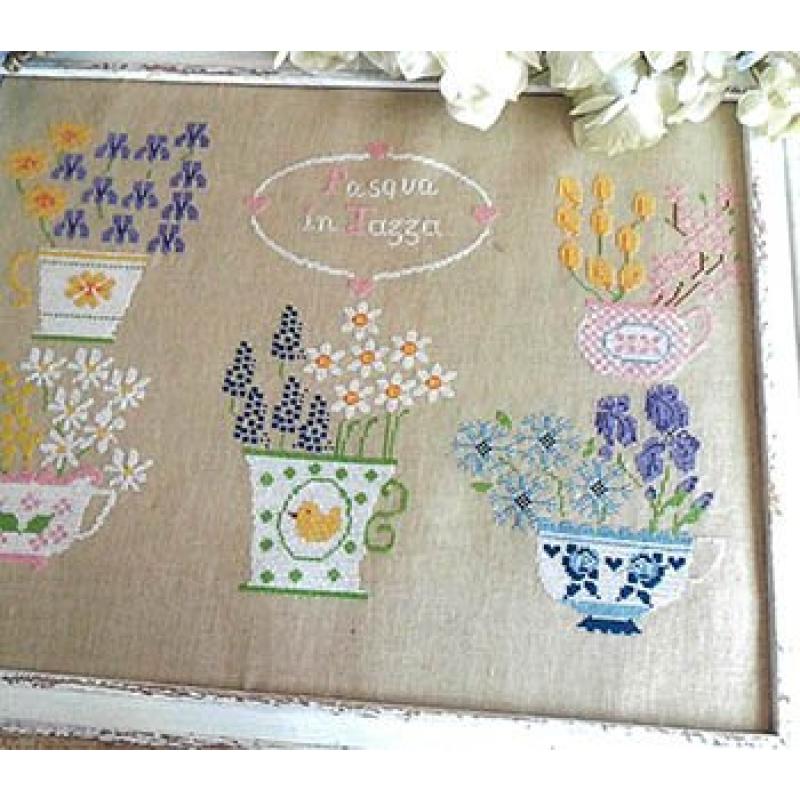 Die Stickvorlage Pasqua in Tazza von Cuore e Batticuore verbindet frühlingshafte Leichtigkeit mit liebevollen Osterdetails. Mehrere dekorative Tassen und Becher sind mit farbenfrohen Blumen gefüllt – ein verspieltes, warmes Motiv, das den Zauber des Frühlings und die Freude des Osterfestes einfängt. In der Mitte steht ein ovaler Rahmen mit dem Schriftzug Pasqua in tazza, der das Thema charmant zusammenfasst.