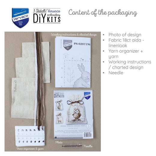 • Die Packung enthält 3 halbfertig genähte Säckchen aus Leinen-Aida 18ct - 7 Stiche / cm (44% Baumwolle, 39% Viskose, 17% Leinen), Stickanleitung in 8 Sprachen, DMC-Stickgarn mit Garnorganisator (5 Farben, 100% Baumwolle), Frontbild, Garn zum Verschließen der Beutel und Sticknadel