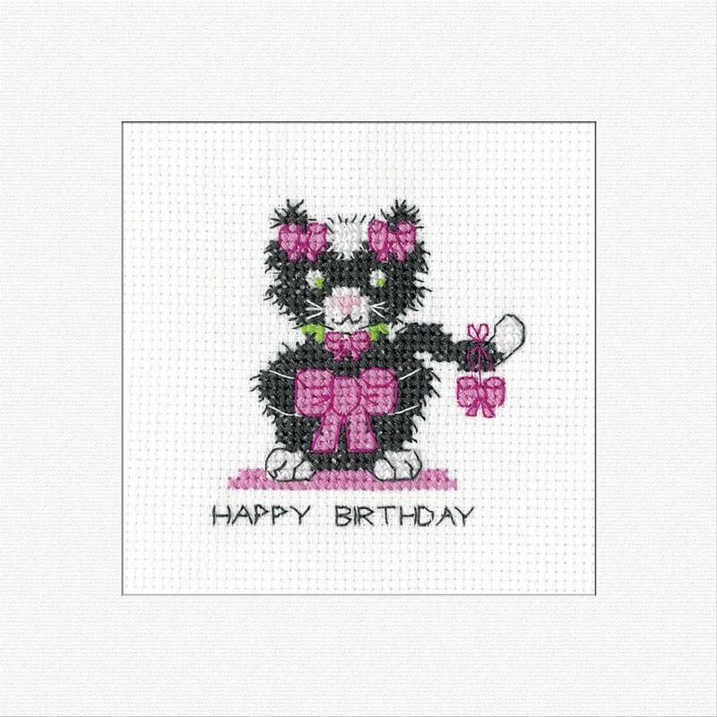 Black Cat Birthday Bow Stickpackung, Heritage Crafts Birthday Card, Katze Kreuzstich Karte, Stickset Geburtstagskarte, Kirsten Roche Stickmuster, Cross Stitch Greeting Card, Katzenmotiv Kreuzstich, Kreuzstichpackung