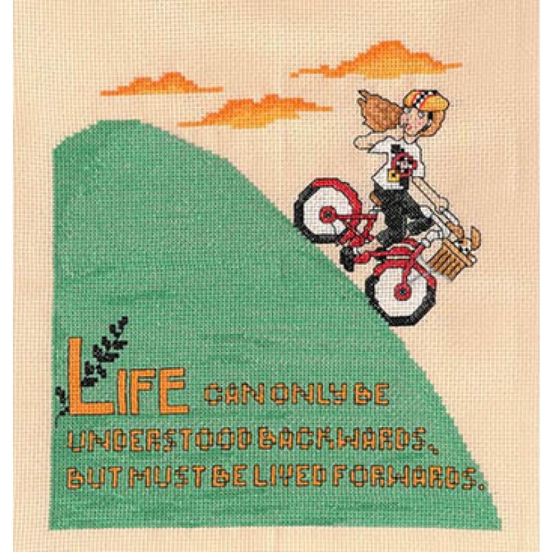 Backwards Stickvorlage, Imaginating Cross Stitch, Motivationsspruch Kreuzstich, Fahrrad Stickmuster, modernes Stickdesign, Inspirational Quote Cross Stitch, sportliches Stickmotiv, Kreuzstichvorlage