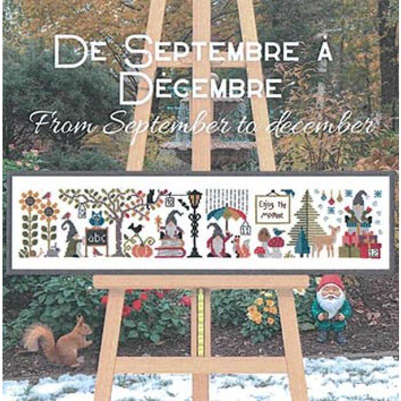 Das Design ist auf einer Staffelei im Garten präsentiert und zeigt eine breite, horizontale Stickszene, die die Monate September bis Dezember darstellt: