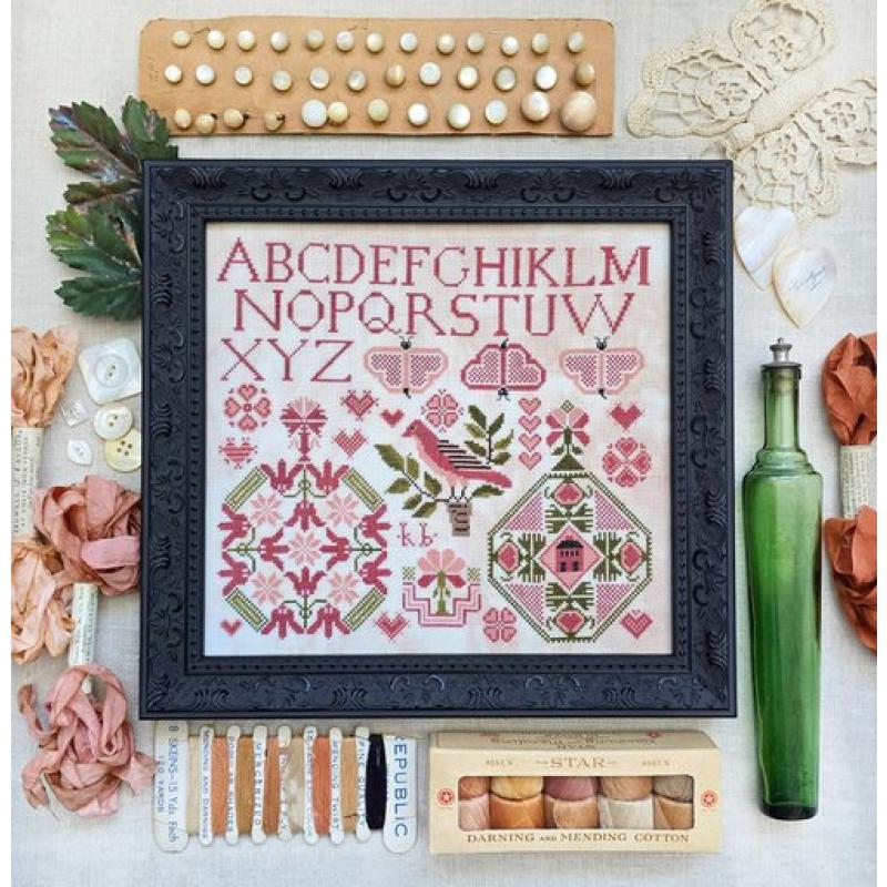 Mit Alphabet, Herzen, floralen Motiven, geometrischen Mustern und einem kleinen Vogel entsteht ein zeitloses Design, das sowohl klassisch als auch modern wirkt – perfekt für Sammlerinnen und Liebhaberinnen historisch inspirierter Stickerei.