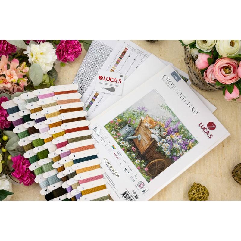 - Zählpackung mit Zählmuster, Kreuzstichset, Stickset gezählter Kreuzstich, Tiere, Katzen, Garten, Natur, Schubkarre mit schlafenden Kätzchen