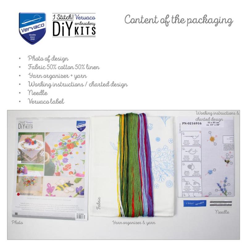 • Die Packung enthält den fertig genähten Läufer (50% Baumwolle, 50% Leinen, das vorgedruckte Design verschwindet nach der Wäsche), Stickanleitung in 8 Sprachen, Stickgarn DMC mit Garnorganisator 19 Farben (100% Baumwolle), Frontbild und Sticknadel