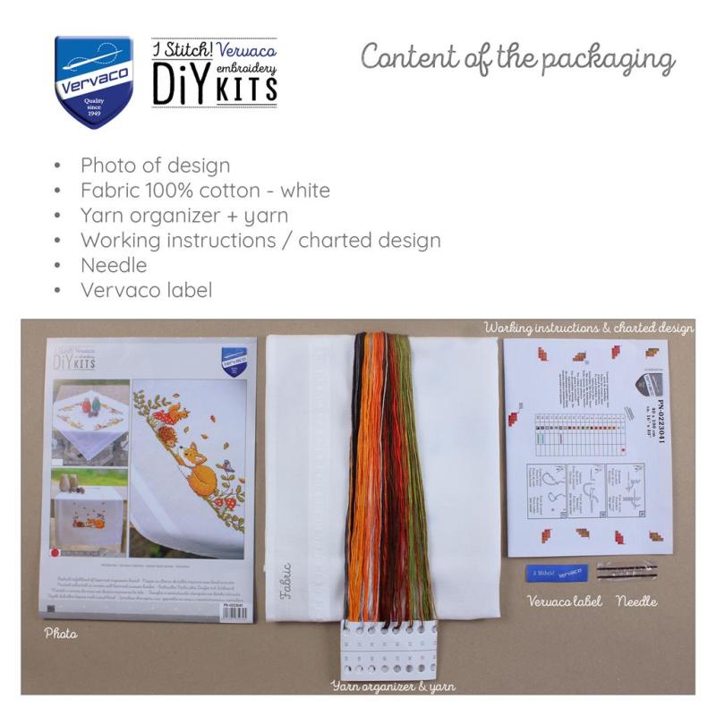 • Die Packung enthält den fertig genähten Läufer (100% Baumwolle, das vorgedruckte Design verschwindet nach der Wäsche), Stickanleitung in 8 Sprachen, Stickgarn DMC mit Garnorganisator 20 Farben (100% Baumwolle), Frontbild und Sticknadel