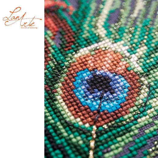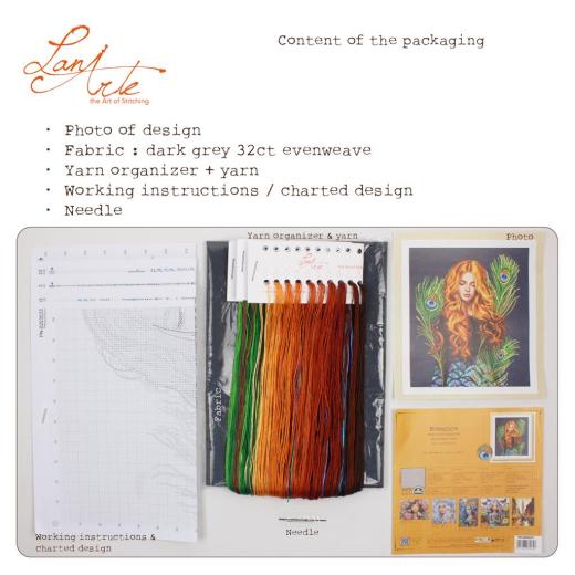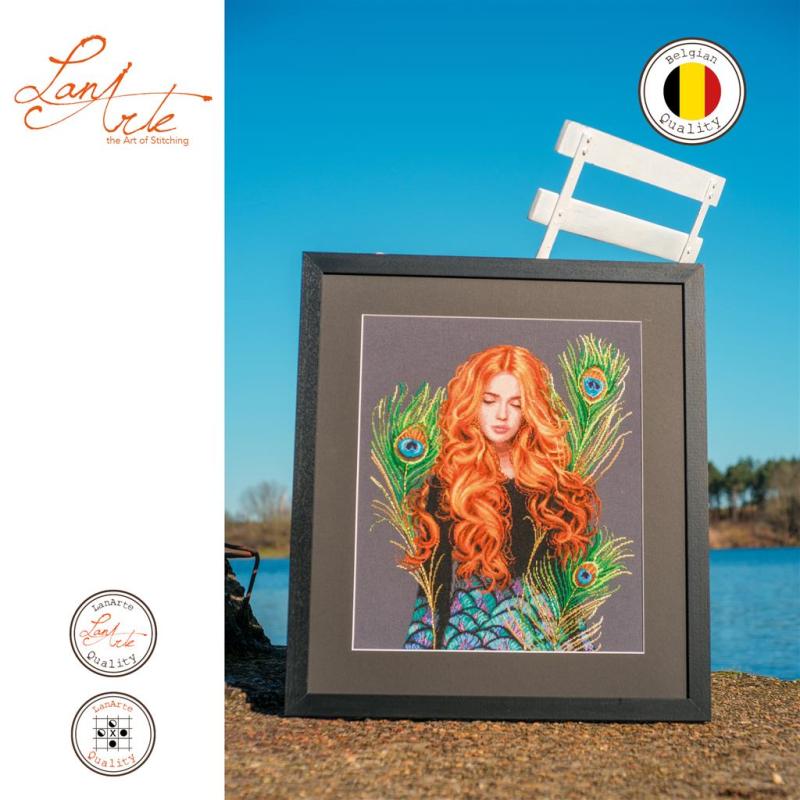 LanArte The Peacock’s Muse Stickpackung, PN‑0203533, Pfauenfedern Kreuzstichset, LanArte Frauenporträt, DMC Stickgarn Set, Evenweave Stickpackung, luxuriöses Kreuzstichmotiv, Kreuzstichpackung