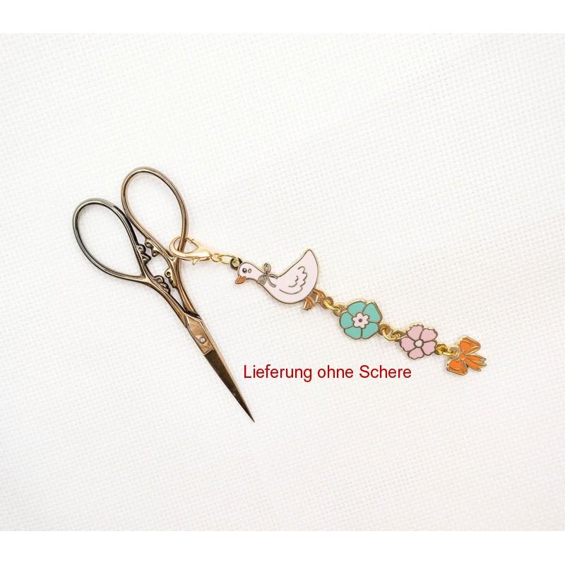 Alle Elemente sind mit goldfarbenen Konturen veredelt und über kleine Metallringe miteinander verbunden. Ein stabiler goldfarbener Karabiner sorgt für sicheren Halt an Stickscheren, Projekttaschen oder Etuis.