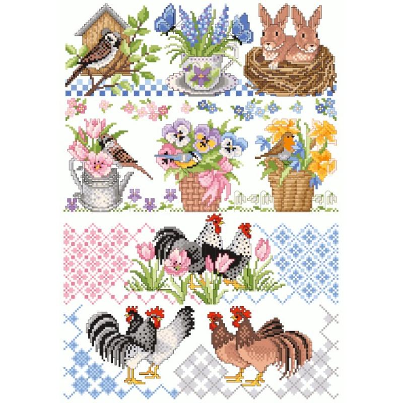 • Zählvorlage, Zählmuster, Sampler Frühling, Jahreszeiten, Tiere, Hühner, Hähne, Vögel