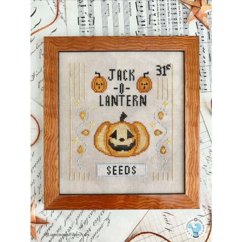 Die Stickvorlage Jack‑O‑Lantern Seeds von Luminous Fiber Arts ist ein liebevoll gestaltetes Halloween‑Design im nostalgischen Vintage‑Stil.