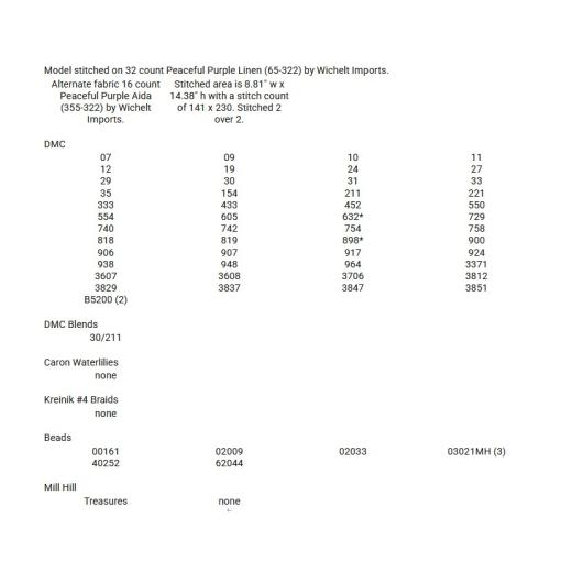 - 32 count Peaceful Purple Linen (65-322) by Permin. Alternate fabric is 16 count Peaceful Purple Aida (355-322) by Permin.