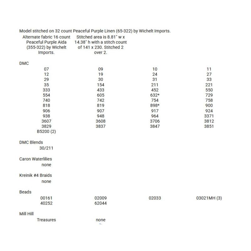 - DMC floss: 07, 09, 10, 11, 12, 19, 24, 27, 29, 30, 31, 33, 35, 154, 211, 221, 333, 433, 452, 550, 554, 605, 632, 729, 740, 742, 754, 758, 818, 819, 898, 900, 906, 907, 917, 924, 938, 948, 964, 3371, 3607, 3608, 3706, 3812, 3829, 3837, 3847, 3851 and B5200 (2). Beads by Mill Hill: 00161, 02009, 02033, 03021 (3), 40252 and 62044.