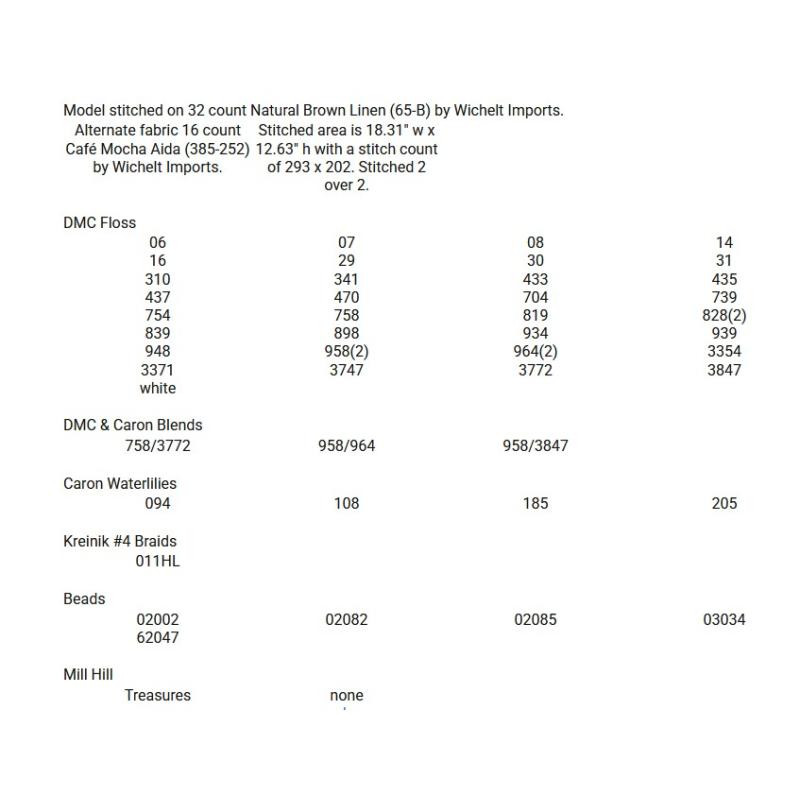 • DMC floss: 06, 07, 08, 14, 16, 29, 30, 310, 341, 433, 435, 437, 470, 704, 739, 754, 758, 819, 828 (2), 839, 898, 934, 939, 948, 958 (2), 964 (2), 3354, 3371, 3747, 3772, 3847 and white. Kreinik #4 Braid: 011HL. Caron Waterlilies: 094, 108, 185 and 205. Beads by Mill Hill: 02002, 02082, 02085, 03034 and 62047