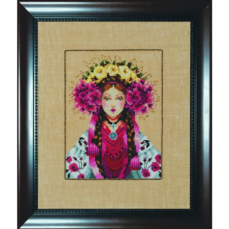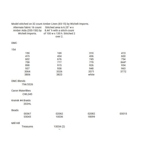 - DMC Stickgarne: 154, 159, 169, 310, 413, 415, 434, 436, 600, 602, 676, 745, 754, 758, 777, 779, 844, 898, 915, 926, 934, 937, 938, 948, 963, 3064, 3326, 3371, 3772, 3806, 3823, white