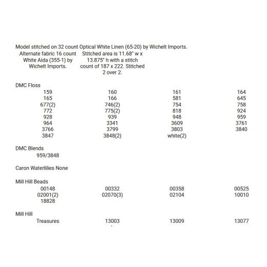 - DMC floss: 159, 160, 161, 164, 165, 166, 581, 677 (2), 746 (2), 754, 758, 752, 775, 818, 924, 928, 939, 948, 959, 964, 3341, 3609, 3761, 3766, 3799, 3803, 3840, 3847, 3848 (2) and White (Blanc) (2.) Kreinik Metallic Floss #4: 009 and 198. Beads by Mill Hill: 00148, 00332, 00358, 00525, 02001 (2 pkgs.), 02070 (3 pkgs.), 02104, 10010 and 18828. Mill Hill Treasures: 13003, 13009 and 13077.