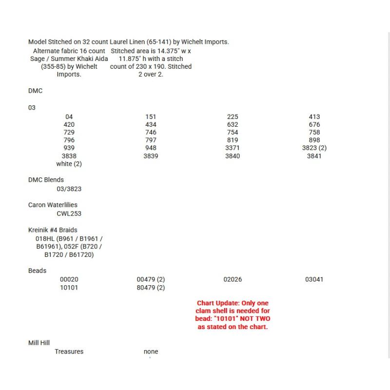 - Beads by Mill Hill: 00020, 2x 00479, 02026, 03041, 10101, 2x 80479