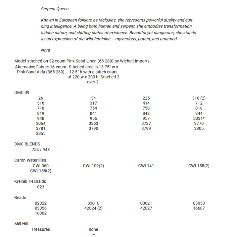 Die Stickvorlage Serpent Queen von Mirabilia zeigt eine majestätische, geheimnisvolle Königin, deren Erscheinung von Eleganz und mystischer Kraft geprägt ist.