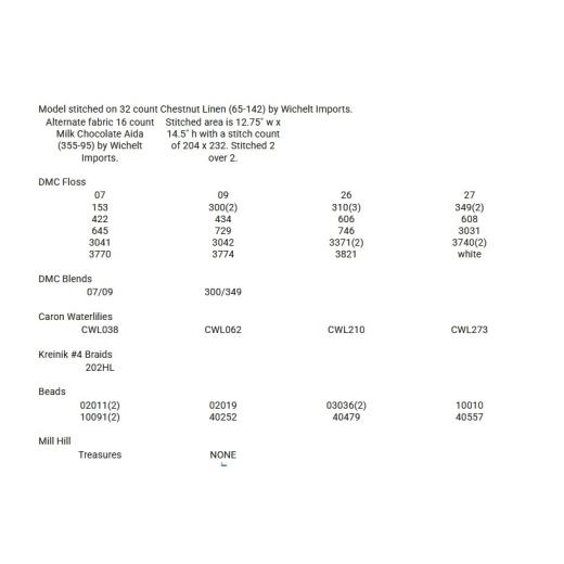 - DMC floss: 07, 09, 26, 27, 153, 300 (2), 310 (3), 349 (2), 422, 434, 606, 608, 645, 729, 746, 3031, 3041, 3042, 3371 (2), 3740 (2), 3770, 3774, 3821 and BLANC (white.) Beads by Mill Hill: 02011 (2), 02019, 03036 (2), 10010, 10091 (2), 40252, 40479 and 40557. Caron Waterlilies: 038, 062, 210 and 273.