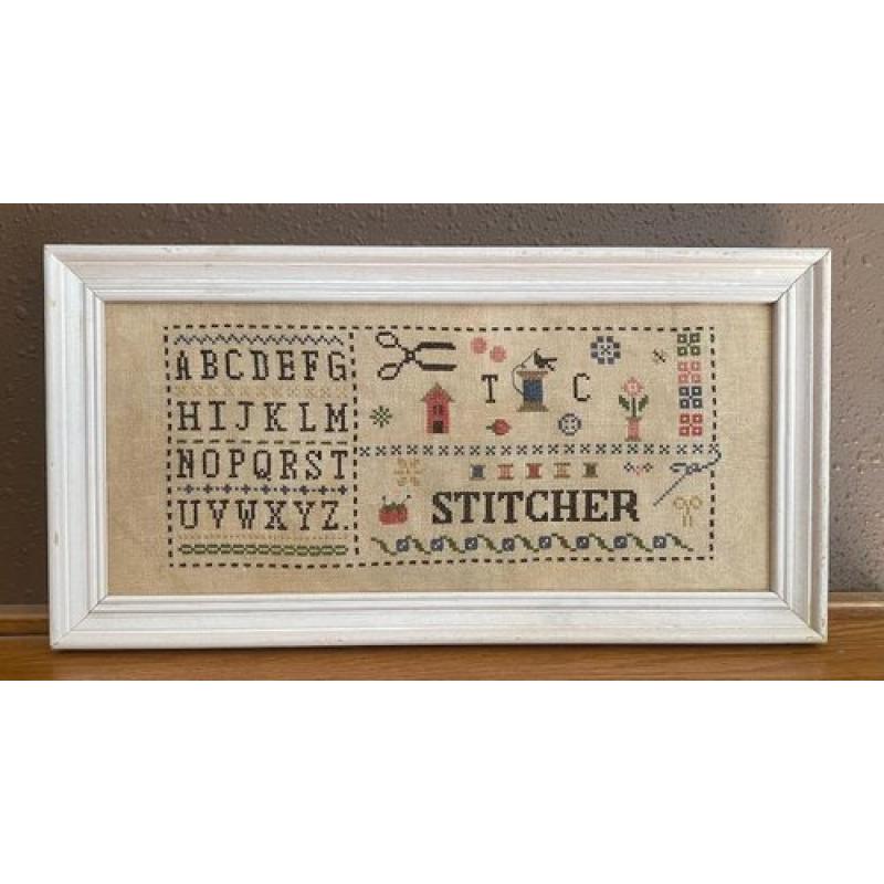 Das Motiv ist zweigeteilt: Links befindet sich ein klar gesticktes Alphabet in drei Reihen. Rechts stehen kleine, charmante Stickmotive wie Schere, Garnrolle, Haus und Blüten. Unter den Motiven prangt der Schriftzug STITCHER in kräftigen Buchstaben, gefolgt von einer dekorativen Wellenbordüre. Die Farbpalette ist warm, freundlich und klassisch – ideal für traditionelle und moderne Stickzimmer.