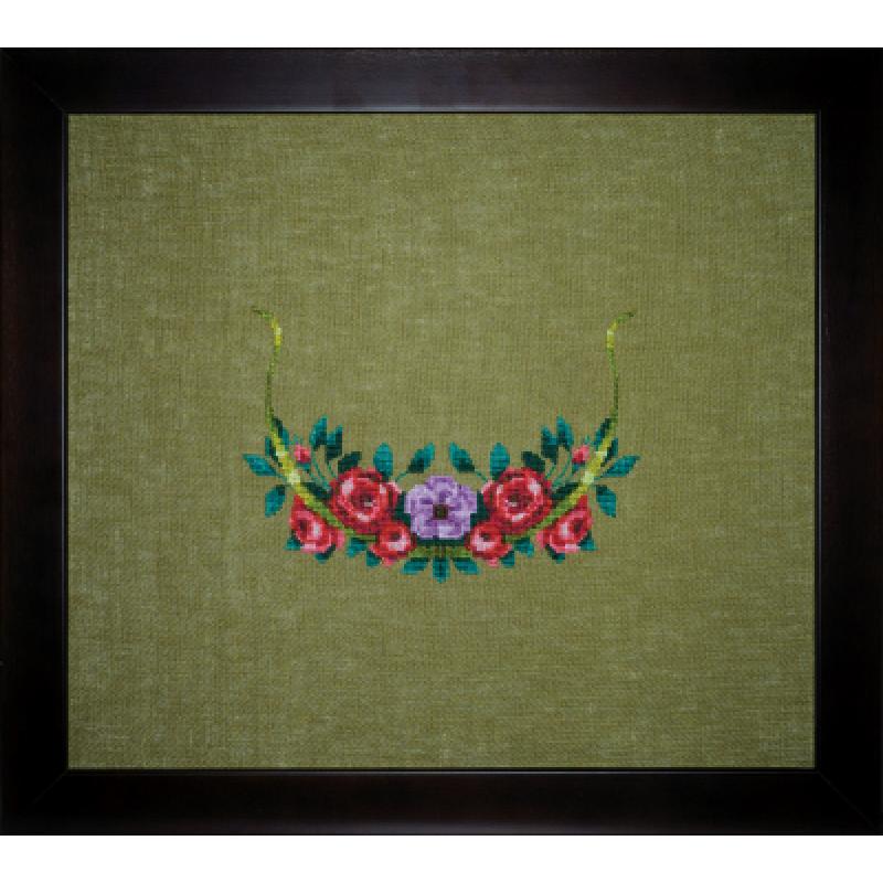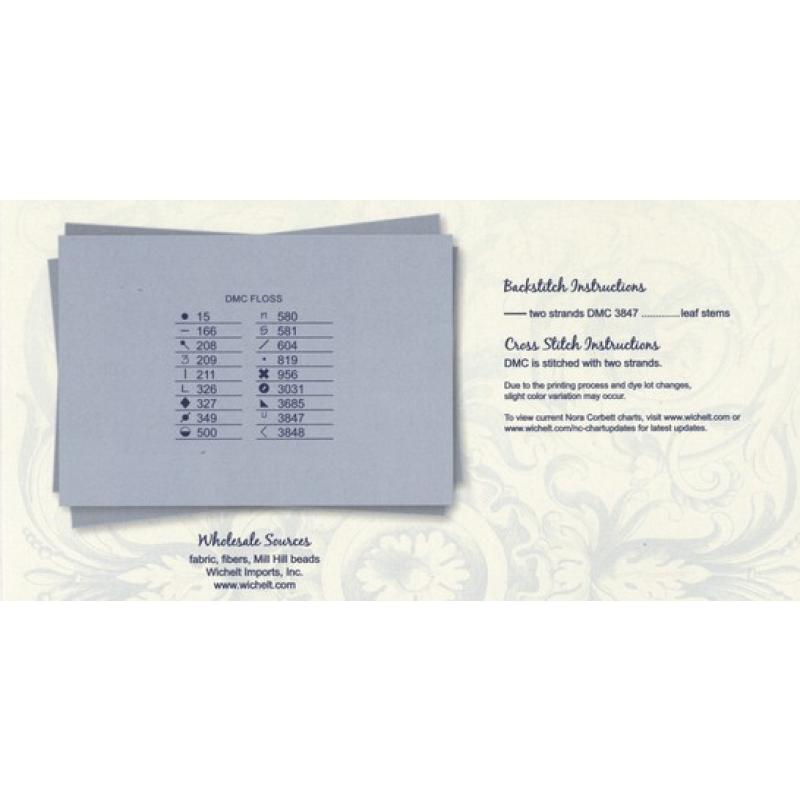 - DMC-Stickgarne: 15, 166, 208, 209, 211, 326, 327, 349, 500, 580, 581, 604, 819, 956, 3031, 3685, 3847, 3848