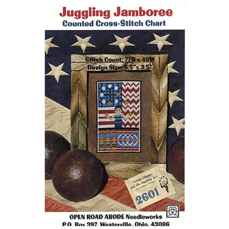 Juggling Jamboree Stickvorlage, Open Road Abode Needleworks, Americana Kreuzstich, Jongleur Stickmuster, Patriotic Mini Projekt, Sommer Stickerei USA, kleines Flaggenmotiv Kreuzstich, humorvolles Stickdesign, 2601 Cross Stitch Chart, rot weiß blau Stickmuster
