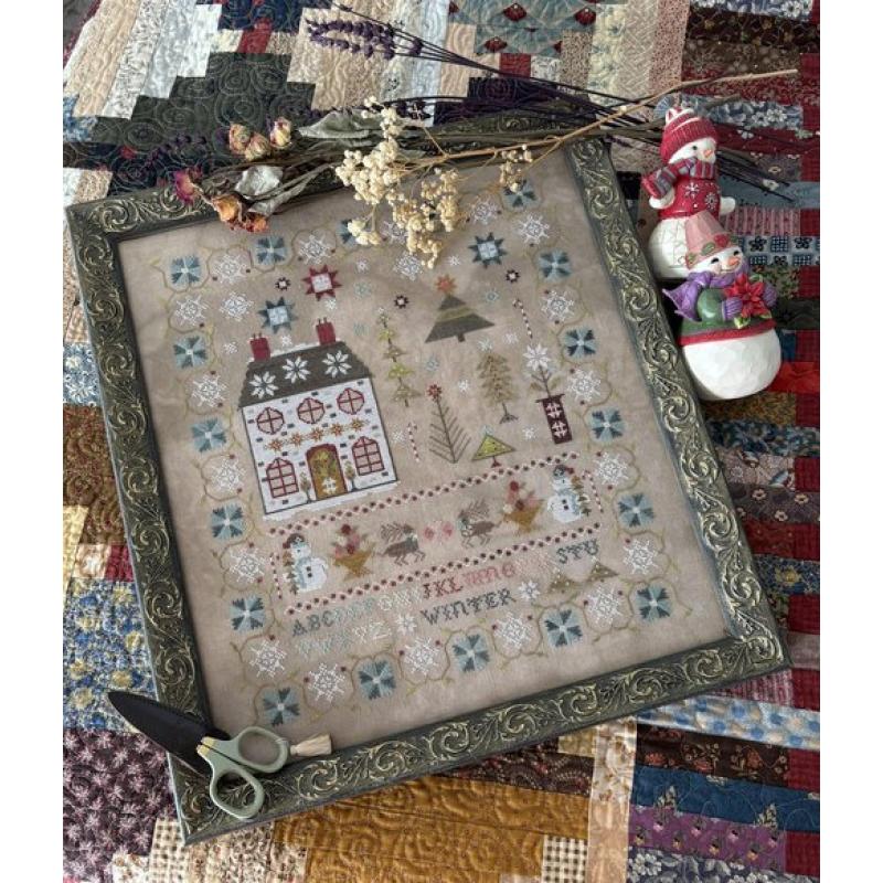 Das Motiv zeigt ein winterliches Haus, flankiert von Bäumen, Schneemännern und kleinen Vögeln. Eine dekorative Schneeflockenbordüre rahmt das Design ein. Der Sampler ist in einem dunklen, verzierten Rahmen präsentiert und liegt auf einem Patchwork‑Quilt, begleitet von winterlichen Accessoires wie kleinen Schneemannfiguren und Stickschere.