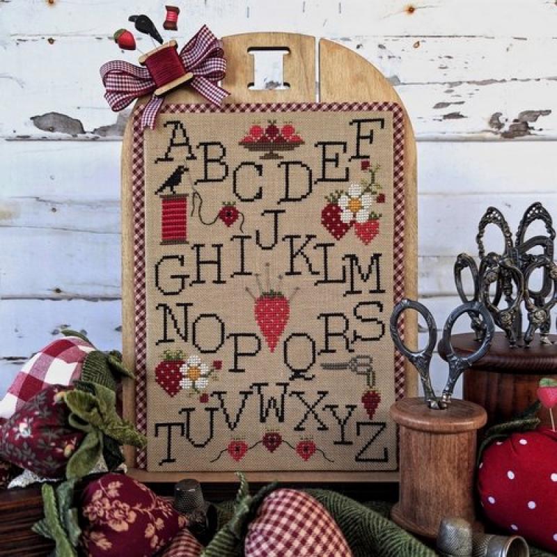 Das Bild zeigt einen rechteckigen Alphabet‑Sampler, der auf einem Holzbrett dekorativ präsentiert wird. Das komplette A–Z‑Alphabet ist in klarer, schwarzer Schrift gestickt. Die Buchstaben sind in harmonischen Reihen angeordnet und wirken klassisch und gut lesbar. Zwischen den Buchstaben befinden sich kleine, liebevolle Motive: rote Erdbeeren mit grünen Blättern, wiße und gelbe Blüten, keine rote Herzen als Akzente