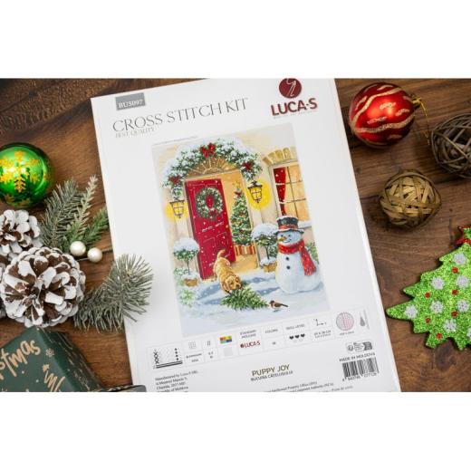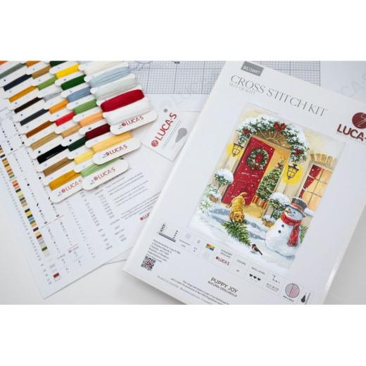 - Zählpackung mit Zählmuster, Kreuzstichset, Stickset gezählter Kreuzstich, Weihnachten, Weihnachtstür mit Schneemann und Hund