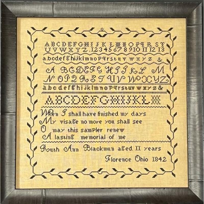 Queenstown Sampler Designs hat hier ein besonders persönliches und historisch wertvolles Werk bewahrt: ein Sampler, der Alphabetübungen, einen poetischen Vers und die Signatur eines 11‑jährigen Mädchens aus Ohio vereint.