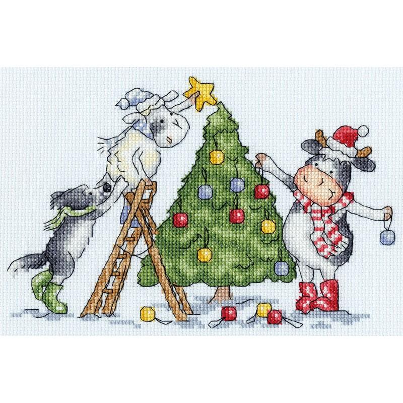 Kuh, Schaf und Hund schmücken gemeinsam den Weihnachtsbaum mit Kugeln und einem Stern