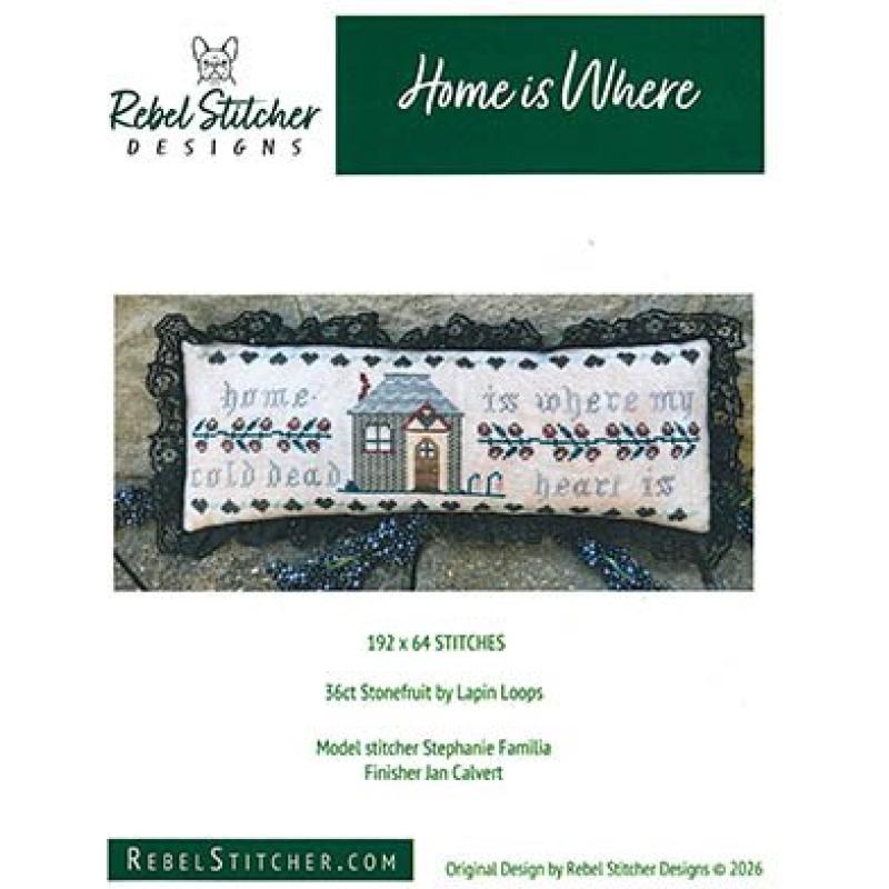 Home Is Where Rebel Stitcher, Rebel Stitcher Designs Stickvorlage, dark humor cross stitch, modernes Typografie Stickmuster, Hausmotiv Stickmuster, contemporary cross stitch design, humorvolle Stickvorlage