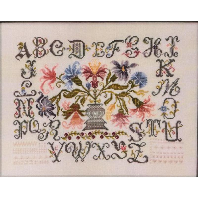 Das gezeigte Bild zeigt ein Stickmotiv mit dem kompletten Alphabet in kunstvoll verzierten Großbuchstaben. Die Buchstaben sind in verschiedenen Farben gearbeitet und bilden einen dekorativen Rahmen um das zentrale Motiv. In der Mitte befindet sich ein reiches Blumenarrangement in einer grauen Vase, bestehend aus Blüten in Rosa, Lila, Blau und Gelb. Die Komposition wirkt ausgewogen und detailliert, mit feinen Schattierungen und klaren Linien.