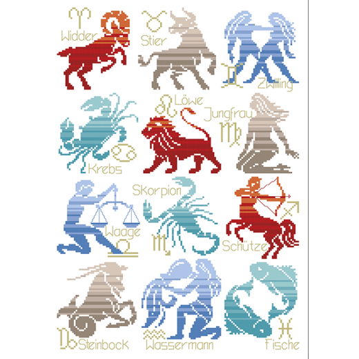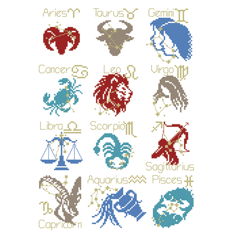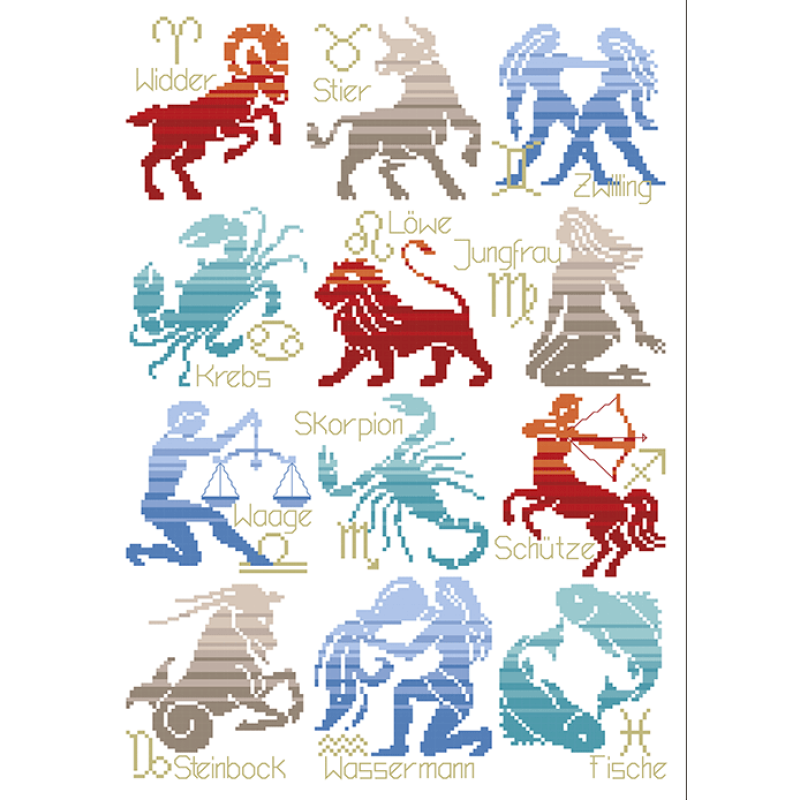 - Zählvorlage, Zählmuster, Sampler Sternzeichen, Jungfrau, Waage, Skorpion, Schütze, Steinbock, Krebs, Wassermann, Fische, Löwe, Widder, Zwilling, Stier, vier Elemente (Erde, Luft, Feuer, Wasser), Sternstunde