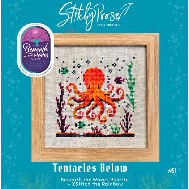Die Stickvorlage Tentacles Below von Stitchy Prose ist ein farbenfrohes, dynamisches Unterwasser‑Design aus der Beneath the Waves Palette – XStitch the Rainbow‑Reihe. Im Mittelpunkt steht ein leuchtend orangefarbener Oktopus, dessen Tentakel sich elegant zwischen Wasserpflanzen, Blasen und kleinen Fischen winden. Das Motiv kombiniert kräftige Farben mit organischen Formen und bringt die Lebendigkeit der Meereswelt perfekt zur Geltung.
