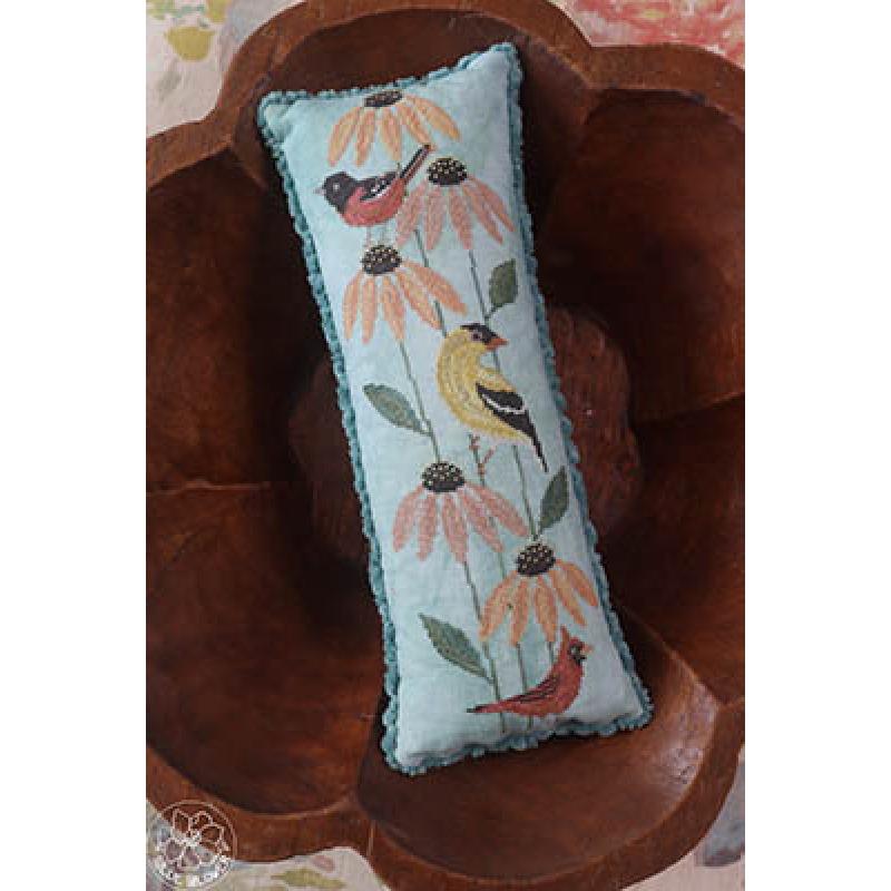 Die Stickvorlage „Coneflower Chorus“ von The Blue Flower ist ein warmherziges, naturinspiriertes Design, das drei kleine Vögel zeigt, die auf hohen Sonnenhut‑Blüten sitzen.
