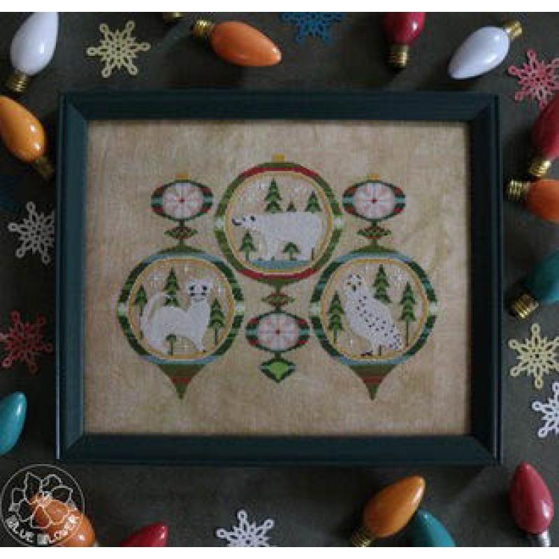 Jedes der drei großen Ornamente enthält ein winterliches Tiermotiv: einen Eisbär, ein Hermelin und eine Schnee-Eule. Alle Tiere sind in runde, reich verzierte Weihnachtsornament eingebettet, die mit winterlichen Mustern und Farbakzenten gestaltet sind.