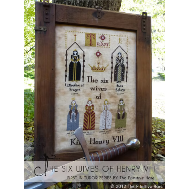Die Stickvorlage Six Wives of Henry VIII von The Primitive Hare ist ein eindrucksvolles, historisch inspiriertes Sampler‑Design und zugleich der erste Teil der Tudor‑Serie. Im Mittelpunkt stehen die sechs Ehefrauen von König Heinrich VIII., jede in charakteristischer Tudor‑Gewandung dargestellt und mit ihrem bekannten Schicksal versehen. Über den Figuren thront der Schriftzug „Tudor“ mit Krone und dekorativen Elementen – ein kraftvolles, erzählerisches Motiv voller Geschichte und Symbolik.