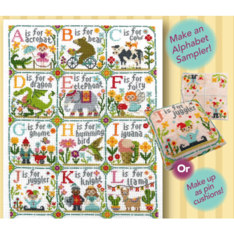- Folgende DMC-Garne werden benötigt: 712, 945, 352, 742 (x2), 740, 606, 3806, 917, 964 (x2), 992 (x4), 907 (x3), 905 (x2), 834 (x2), 833, 831, 437, 435, 168, 169 (x2) and 413.