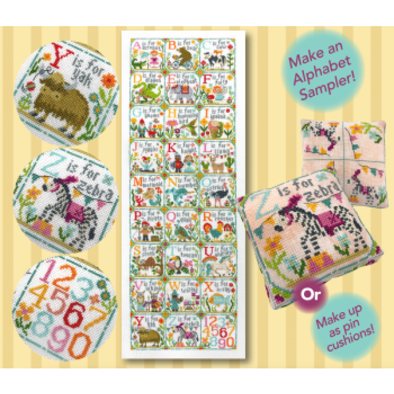 - Folgende DMC-Garne werden benötigt: 712, 945, 352, 742 (x2), 740, 606, 3806, 917, 964 (x2), 992 (x4), 907 (x3), 905 (x2), 834 (x2), 833, 831, 437, 435, 168, 169 (x2) and 413.