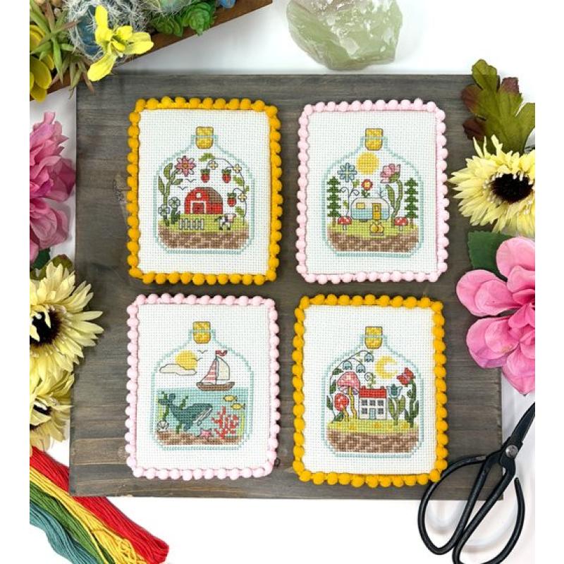 Stickvorlage Summer in 4 Bottles, Tiny Modernist Stickmuster, Sommer Kreuzstich, Mini Flaschenmotive Stickvorlage, Segelboot Stickmuster, Camper Stickmotiv, Sommer Stickmuster kaufen