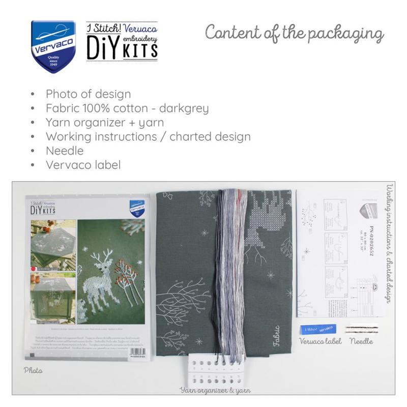 • Die Packung enthält die fertig genähte Tischdecke (100% Baumwolle,  das vorgedruckte Design verschwindet nach der Wäsche), Stickanleitung in 8 Sprachen, DMC Stickgarne 6 Farben (100% Baumwolle), Frontbild und Sticknadel