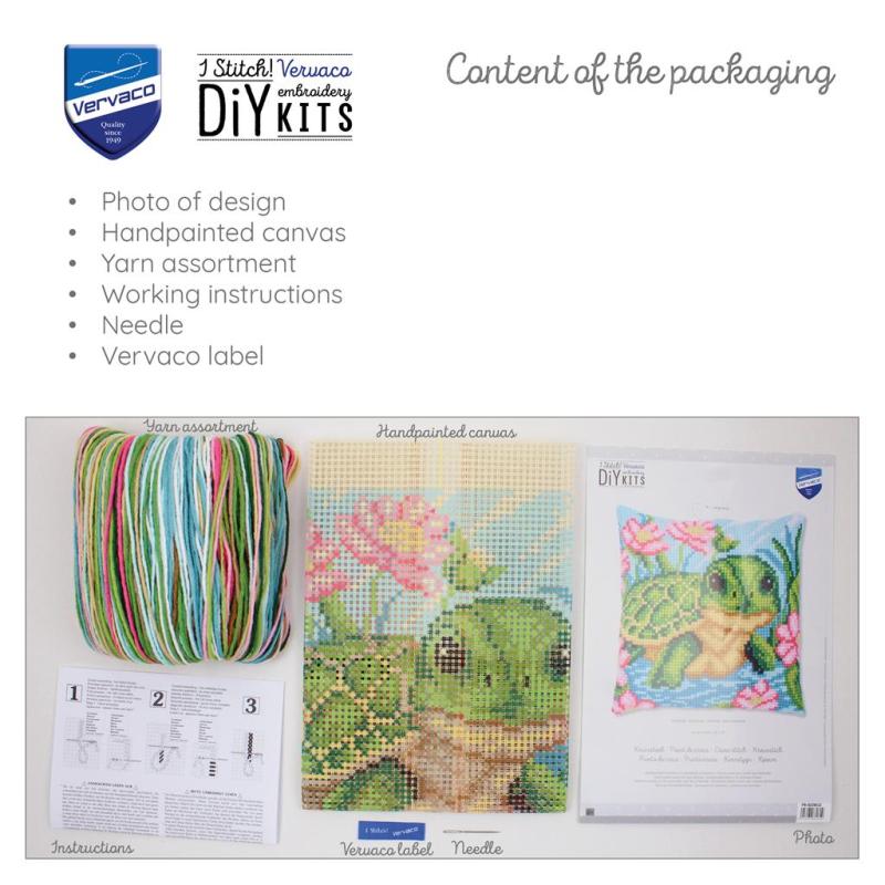 Vervaco Schildkröte Stickpackung, PN‑0228632, Little Turtle Kissen sticken, Kreuzstichkissen Tiermotiv, Vervaco Kissenstickset, DMC Garn Kissen, Kinderzimmer Stickkissen