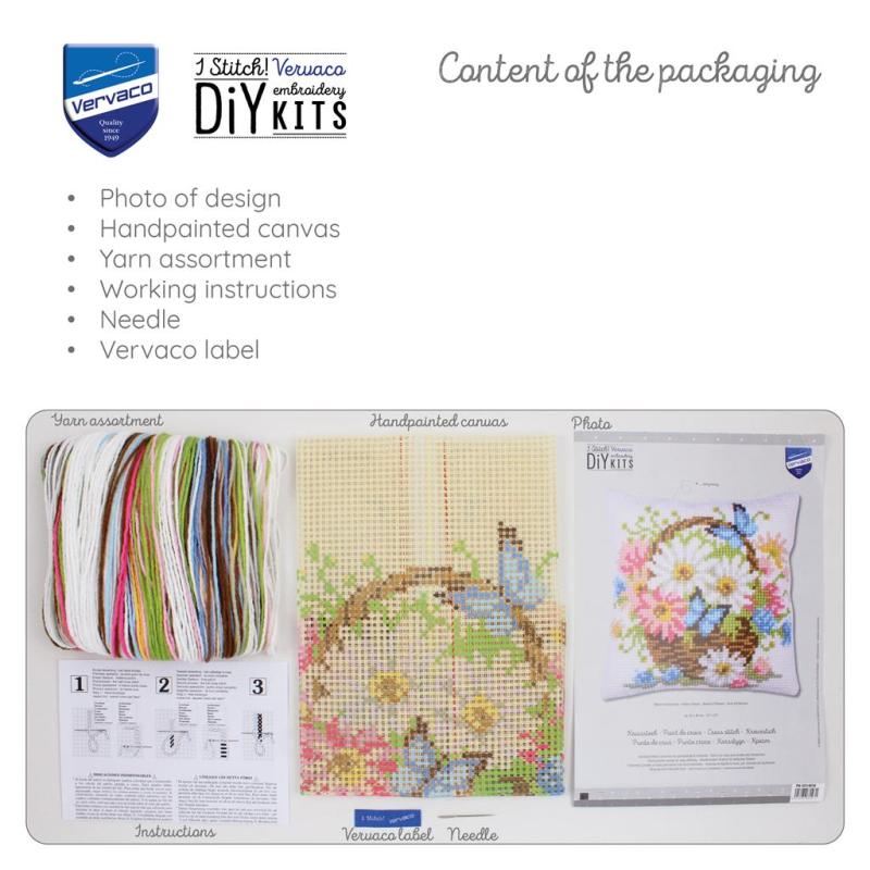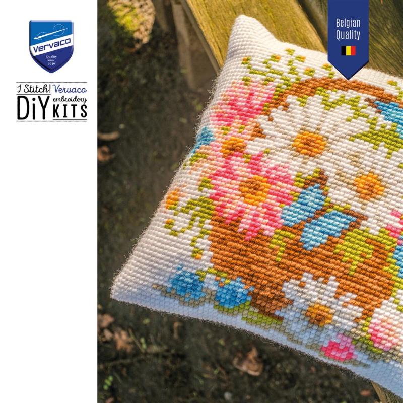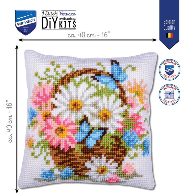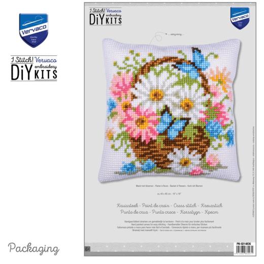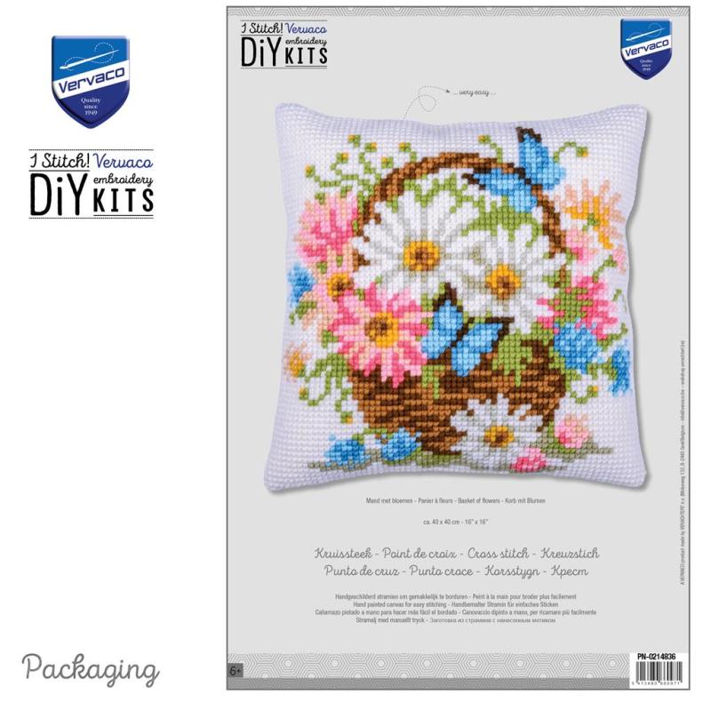 Vervaco Korb mit Blumen Stickpackung, PN‑0214836, Basket of Flowers Kissen sticken, Kreuzstichkissen Blumen, Vervaco Kissenstickset, DMC Garn Kissen, florales Stickkissen