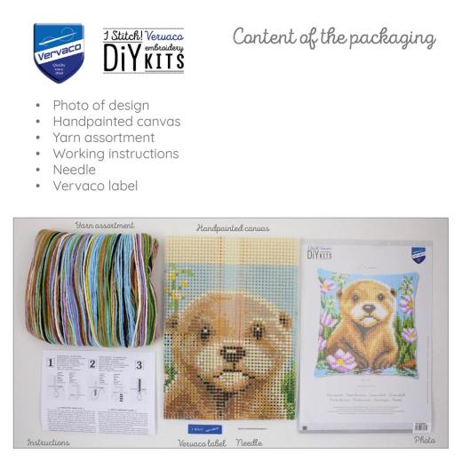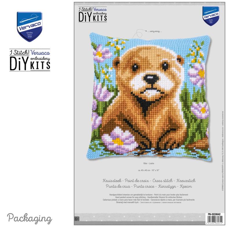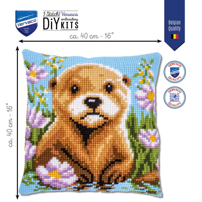 Vervaco Otter Stickpackung, PN‑0228642, Otter Kissen sticken, Kreuzstichkissen Tiermotiv, Vervaco Kissenstickset, DMC Garn Kissen, Tiermotiv Stickkissen