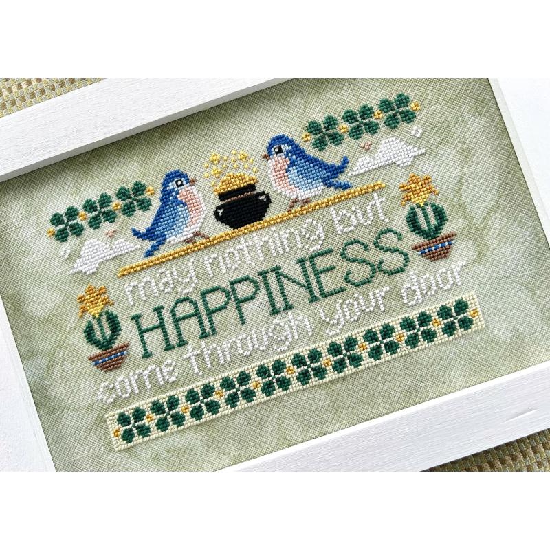 Die Kreuzstichvorlage Wordy Birds - March von Sweet Wing Studio ist der dritte Teil der Wordy Birds-Serie, frisch, grün und bereit für die Stickerei im März. Es zeigt zwei Blaumeisen zwischen Kleeblättern und einem Glückstopf gefüllt mit Gold. Darunter zwischen Blumen der Schriftzug "may nothing but Happiness - come through your door"