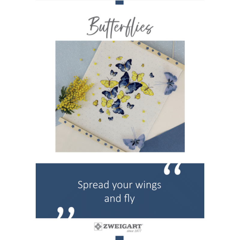 Die kostenlose Stickvorlage „Butterflies“ von Zweigart zeigt eine zarte, moderne Schmetterlingskomposition, die Leichtigkeit, Frühling und natürliche Eleganz vereint. Das Motiv kombiniert stilisierte Schmetterlinge in harmonischen Farben mit feinen grafischen Akzenten, die an warme Tage, blühende Gärten und sanfte Bewegungen erinnern. Das Design wirkt freundlich, dekorativ und zeitlos – ideal für Frühlings‑ und Sommerprojekte, Geschenkideen oder als frischer Akzent im Wohnbereich. Durch die klare Struktur eignet sich die Vorlage sowohl für Anfänger als auch für erfahrene Sticker/innen.